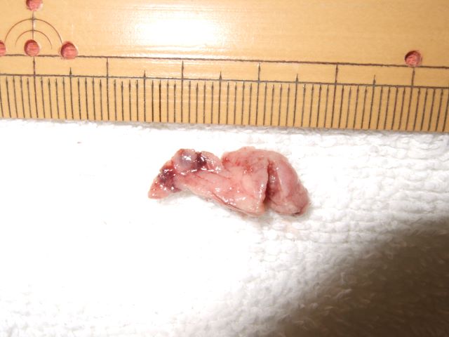 軽度腫大(長径約10mm)したフェレットの左副腎(陰部の腫れもあり)。当院では、投薬での治療を基本にしています。